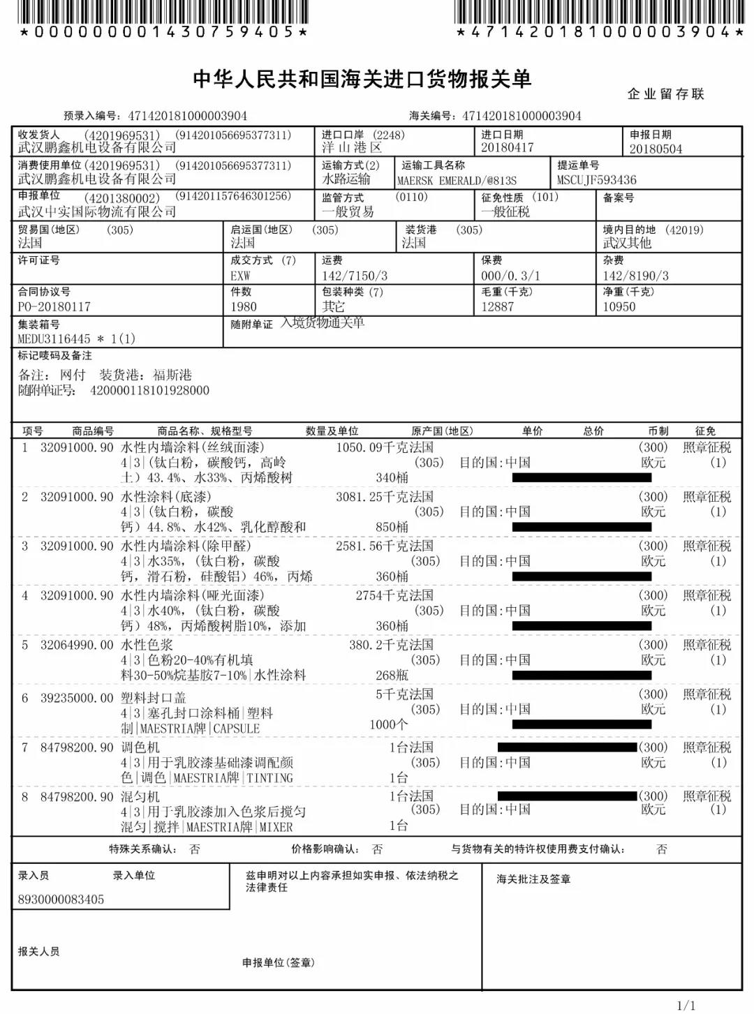 法国美斯第二批家装涂料于2018年2月20日在法国帕米耶工厂装箱启运,历时长达两个多月,于5月7日清关完成。终于在今日抵美斯涂料中国区总代武汉鹏鑫仓库。