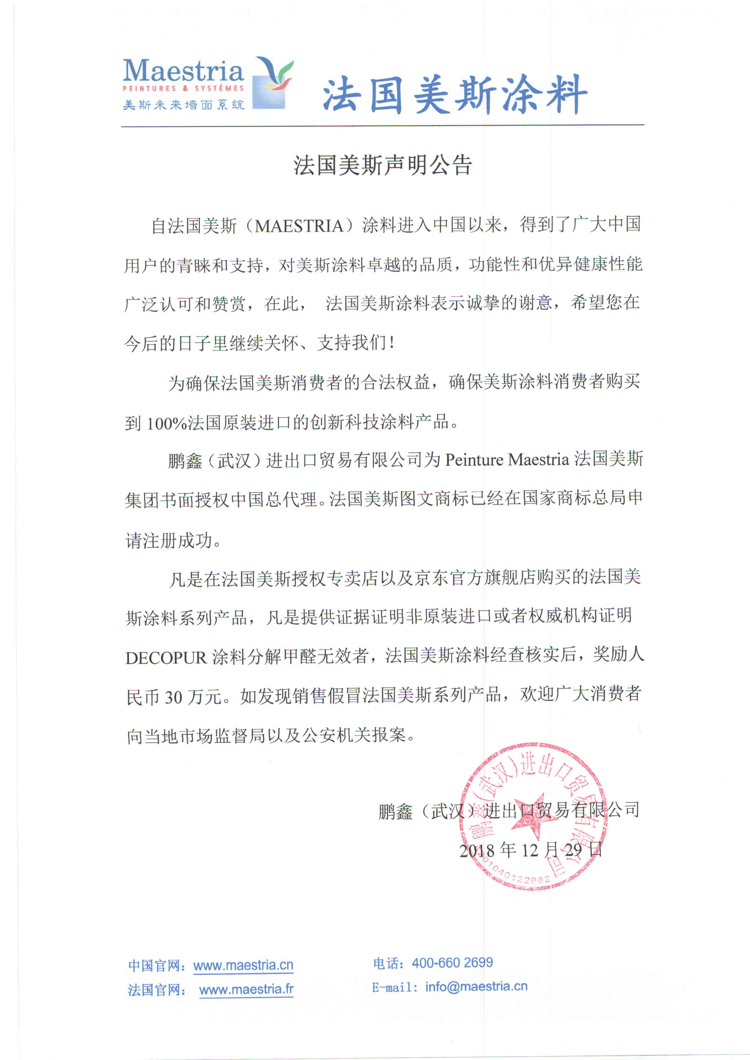 鹏鑫(武汉)进出口贸易有限公司为Peinture Maestria法国美斯集团书面授权中国总代理。法国美斯图文商标已经在国家商标总局申请注册成功。