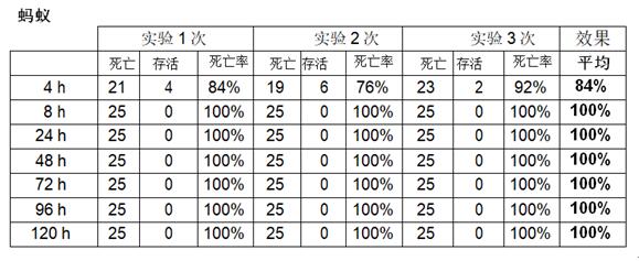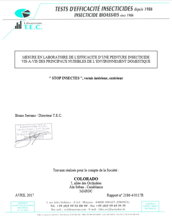 整个实验以符合法国农业部的试验标准进行测试,挑选了家蝇、埃及伊蚊、德国蟑螂和黑褐蚁四种虫蚁,实验内容:测试四种虫蚁在涂了驱虫涂料的样板和不具有驱虫涂料的样板做比较,实验数据:记录虫蚁的死亡比例和耗费时间。