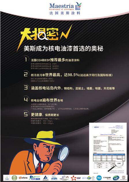 法国美斯(Maestria)是法国最大的涂料生产商,其涂料广泛应用于核电站,石化冶金、商业建筑、地坪、路面标识等领域,严苛标准,美斯核电涂料是法国电力集团(EDF)、法国电网(ERDF)推荐最多的品牌。