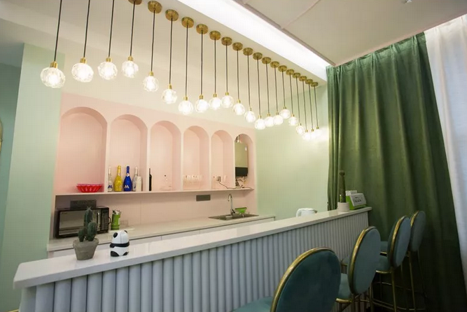 以深海蓝为主色调,通过灯光的效果,更添加神秘感,浪漫又不失优雅,不同颜色的空间里,跳色的软装为空间增加了温度,身心得到最大的放松。
