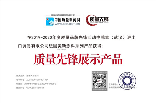 用户的口碑是产品质量标准的重要因素,而获得权威机构的认证是企业产品实力的有力证明,近日,在中国质量新闻网2019年质量品牌先锋活动中,法国美斯涂料荣获“质量先锋展示产品”荣耀称号。