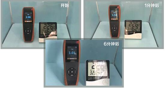 实验场景1:两个构造一样的密封空间,分别放入专业的甲醛测量仪、温湿度计,然后在两个空间里放上同剂量的甲醛水溶液,使空间充满了甲醛气体。