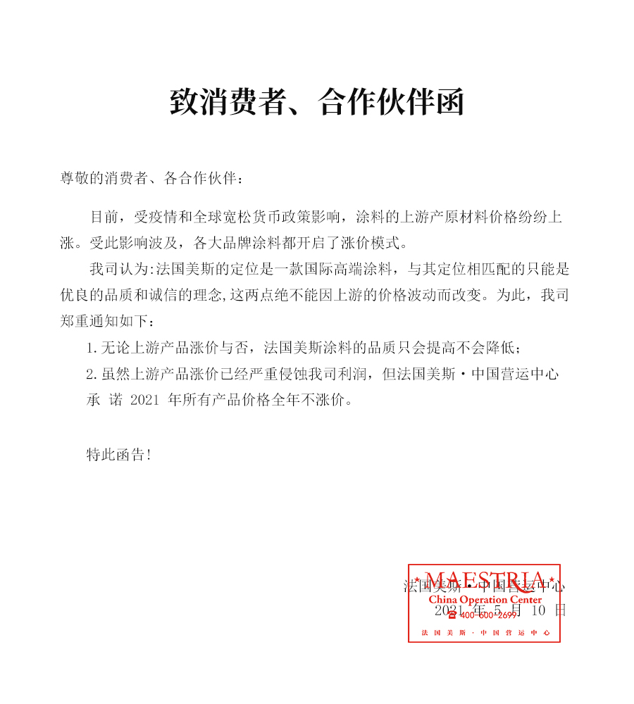 对抗当前的原材料涨价负面影响,不仅需要坚持国家政策层面的宏观引导,更需要涂料企业肩负起企业责任。此时,法国美斯率先站出来,发表了一份“全年不涨价”声明,内容如下:
