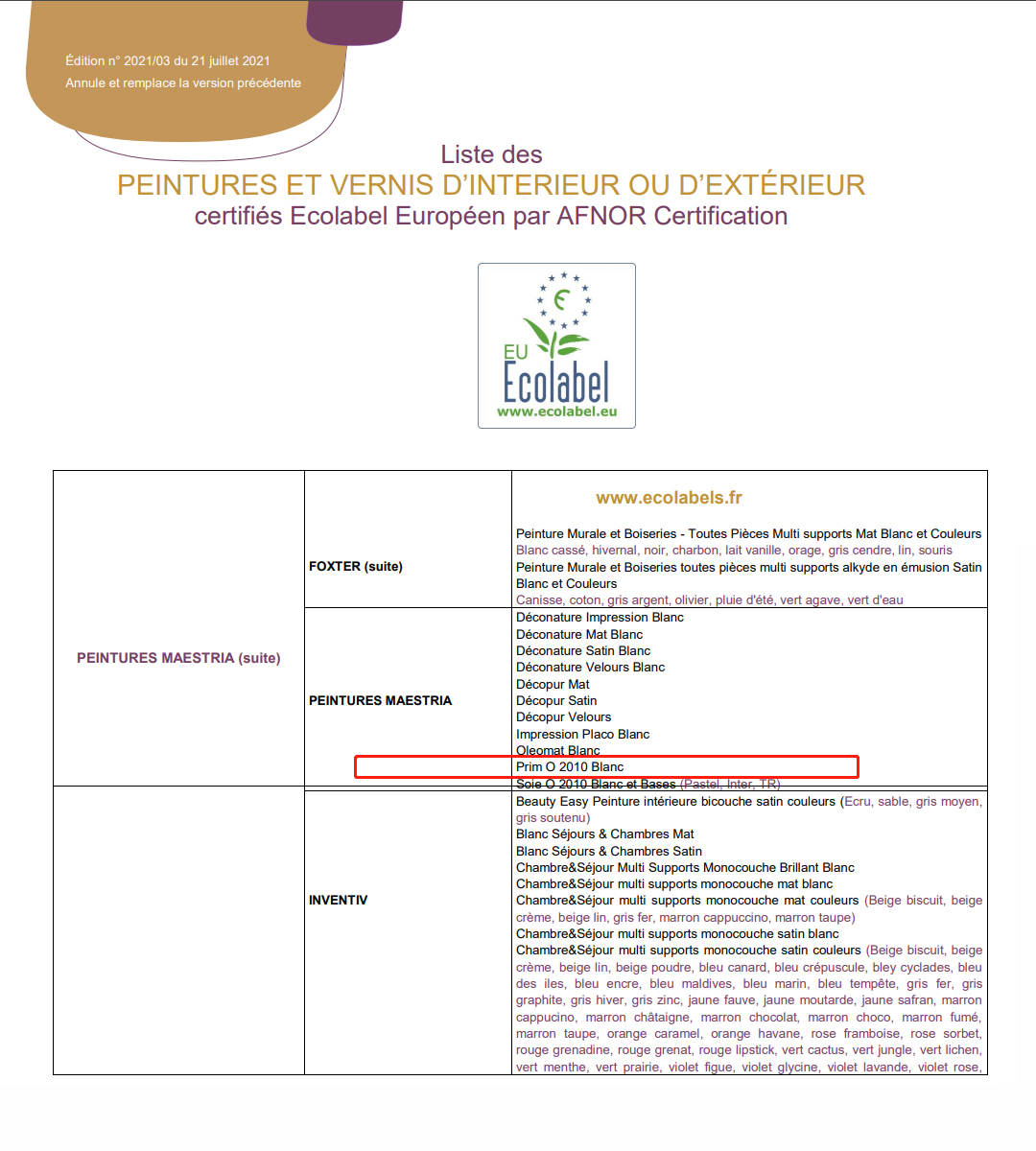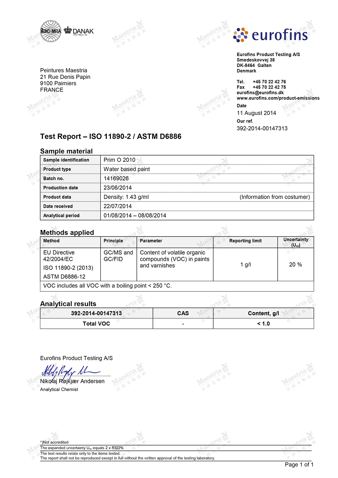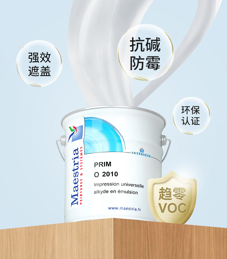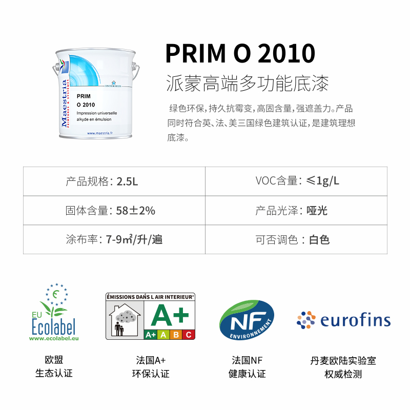 法国美斯涂料——派蒙多功能底漆,不仅具备高渗透力、高效防霉抗碱、遮盖力好的优点,同时漆膜还具备多微孔结构,让基材能够自由呼吸!最、最、最难能可贵的是,同时具备法国室内A+认证以及欧盟生态环保认证,更经过欧洲著名实验室:丹麦欧陆实验室专业检测,可挥发性有机化合物VOC含量小于1g每升(VOC<1g/L),使墙面装饰涂刷更加的健康环保。