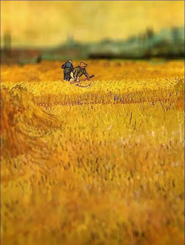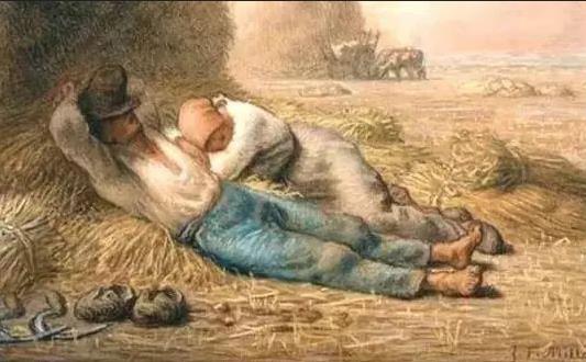 米勒的《午休》表现的是草垛旁劳作了半天的夫妻在安静地午睡,画面恬静,温馨无比,仿佛听得见田地里蝉的鸣叫,闻得见成熟稻草的气息。凡高笔下的《午休》中,熟睡的人们却能反衬出充斥着整件作品的生命张力,耀眼的金色不仅让正在午休的人们散发活力,更是让观看的人们倍感生命自身的力量。