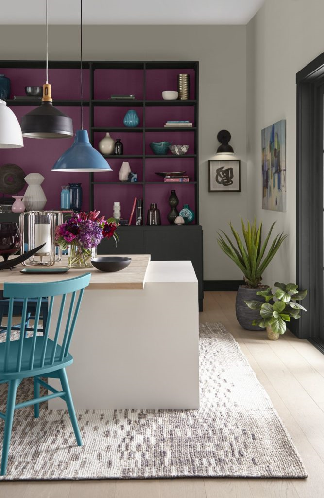 洋红紫是空间设计中不错的墙面辅助色,非常有复古的艺术气息,优雅又贵气。并且结合其它的装饰,让家居整体呈现浪漫气息,不管是客厅、餐厅还是卧室、厨房,都很适合这样的风格。