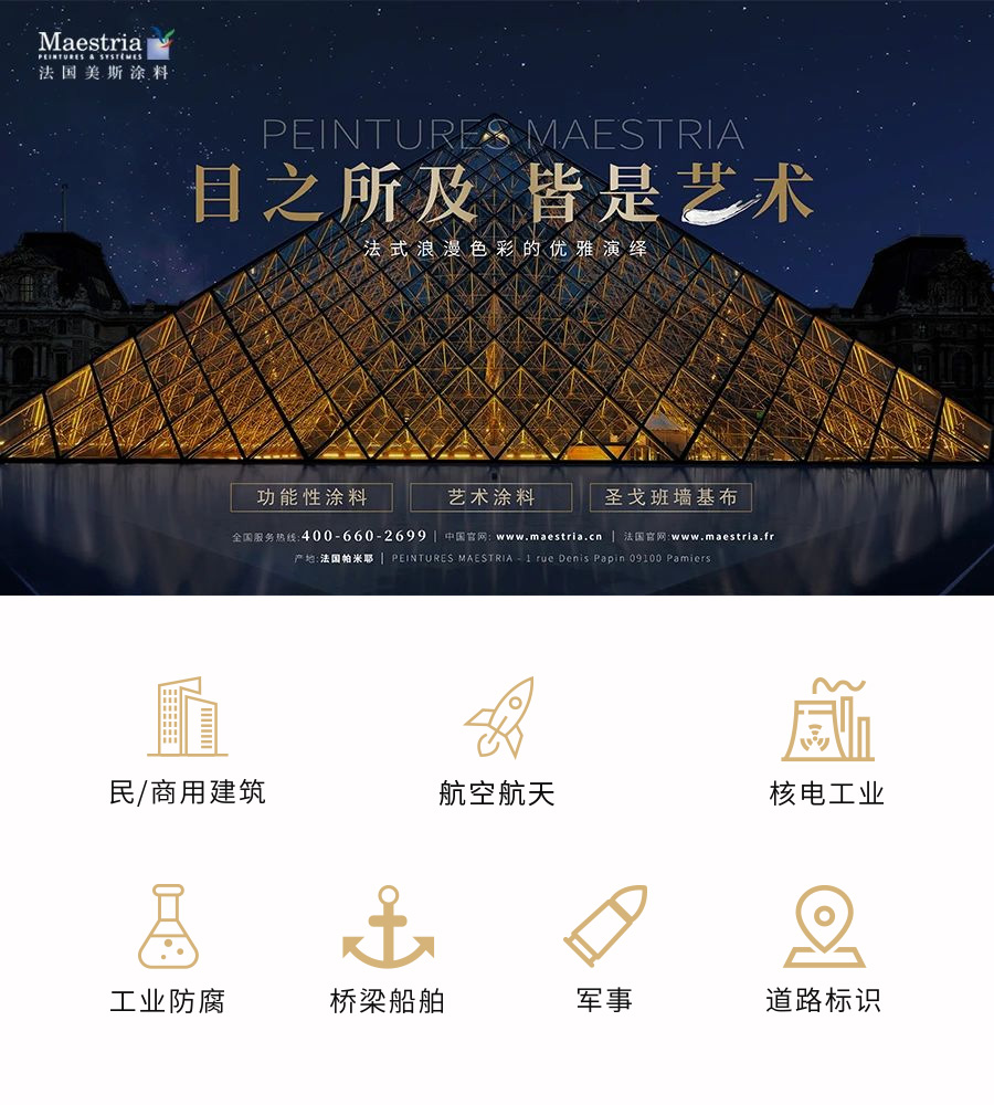 作为法国涂料第一品牌,法国美斯涂料在华业务分为核电工业涂料及家装建筑涂料等板块。其中建筑涂料旗下的分解室内甲醛涂料、纯植物涂料、驱蚊虫涂料等功能性涂料畅销世界;更荣获央视上榜品牌、CCTV《匠心》品牌荣誉称号,海内外载誉无数,市场认知度和消费者好评度非常高。