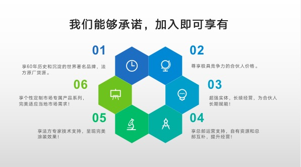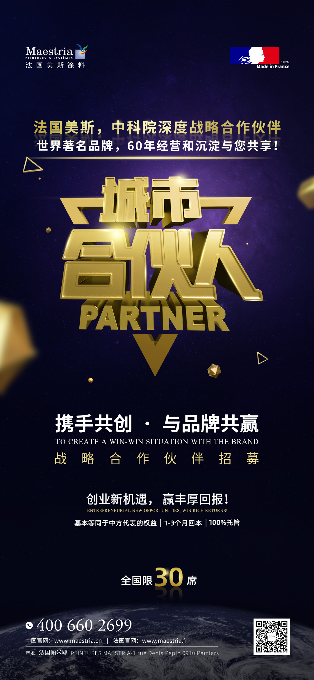 为回馈消费者的信任和期待,作为法国美斯的中方代表,武汉鹏鑫会将继续深耕中国市场,并将建筑涂料板块业务向全国30个潜力城市诚意招募城市合伙人。在开放共赢的合作前提下,我们将为合伙人提供等同于中方代表的权益。