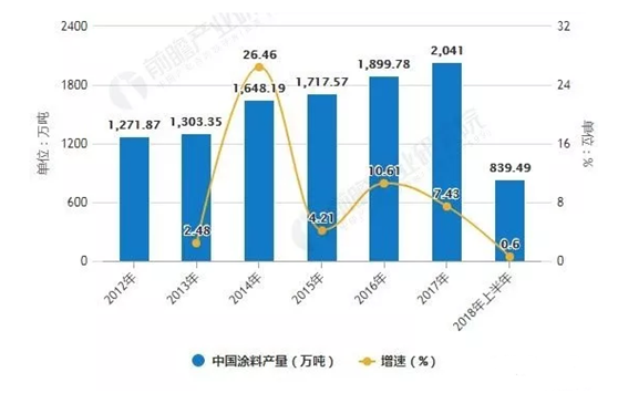 据前瞻产业研究院近期发布的 《涂料行业市场需求预测与投资战略规划分析报告》 资料显示,2017年中国涂料产量已达2041万吨,首次突破年产量2000万吨大关。但值得注意的是,中国涂料产量增速有了明显的放缓。截止到2018年上半年全国规模以上企业涂料产量累计839.49万吨,同比增长了0.6%。上半年累计产量排在前3位省市的分别是:广东省176.47万吨,同比-4.9%;上海98.44万吨,同比-12.1%;江苏省97.27万吨,同比-2.0%。