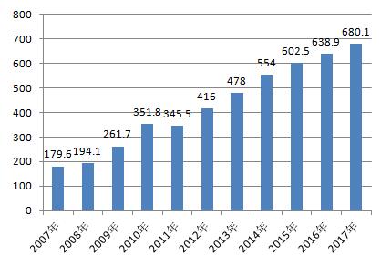 2007-2017年我国建筑涂料产量走势图(单位:万吨)
