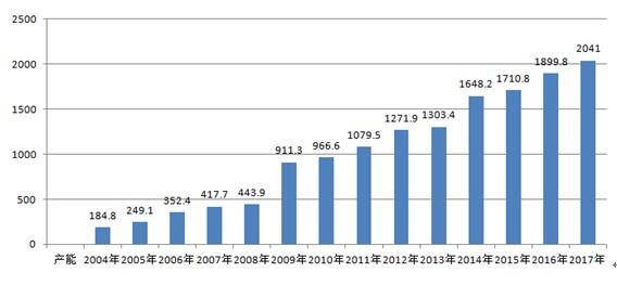 2004 -2017年我国涂料产量及增长率图(单位:万吨)
