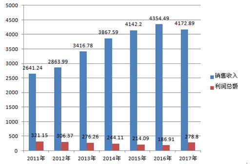 2017年,在供给侧改革和环保政策下,钛白粉、溶剂、TDI、树脂等涂料原材料成本有所涨幅,迫使不少涂料企业上调产品价格,导致2017年的销售额较2016年有所回落。2017年涂料行业全年规模以上工业企业2057家,主营业务收入达4172.89亿元,2017年我国涂料行业利润总额为278.8亿元。