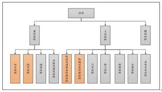 按涂料用途为主线并适当辅以主要成膜物对涂料进行分类,可将涂料分为建筑涂料、工业涂料和辅助材料三大类,如下图所示: