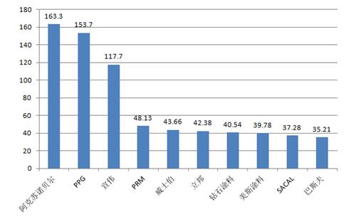 2016年全球十大涂料生产企业销售收入(单位:亿美元)
