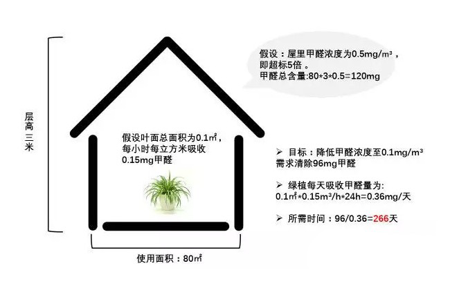 这样的净化的时间也要266天.....其实效果还不如你开窗通风呢,要是你家房子面积再大一点,甲醛的浓度在高一点,吊兰的生命力再弱一点......