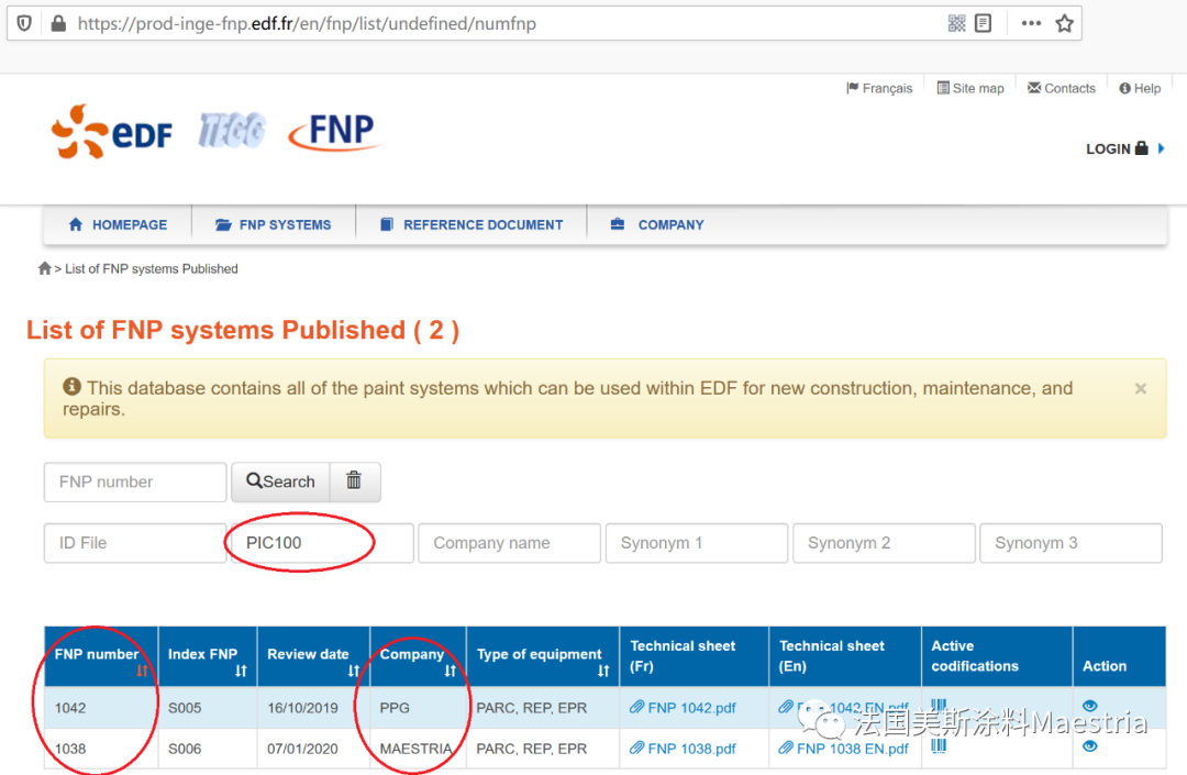还是用代码PIC100核电涂料来举例,可以直接在EDF官网上找到EDF和CEA共同推荐的PIC100核电涂料,可以直接在EDF网站system condification方框内输入PIC100即可查询到推荐使用的涂料厂家及对应涂料系统技术数据表,